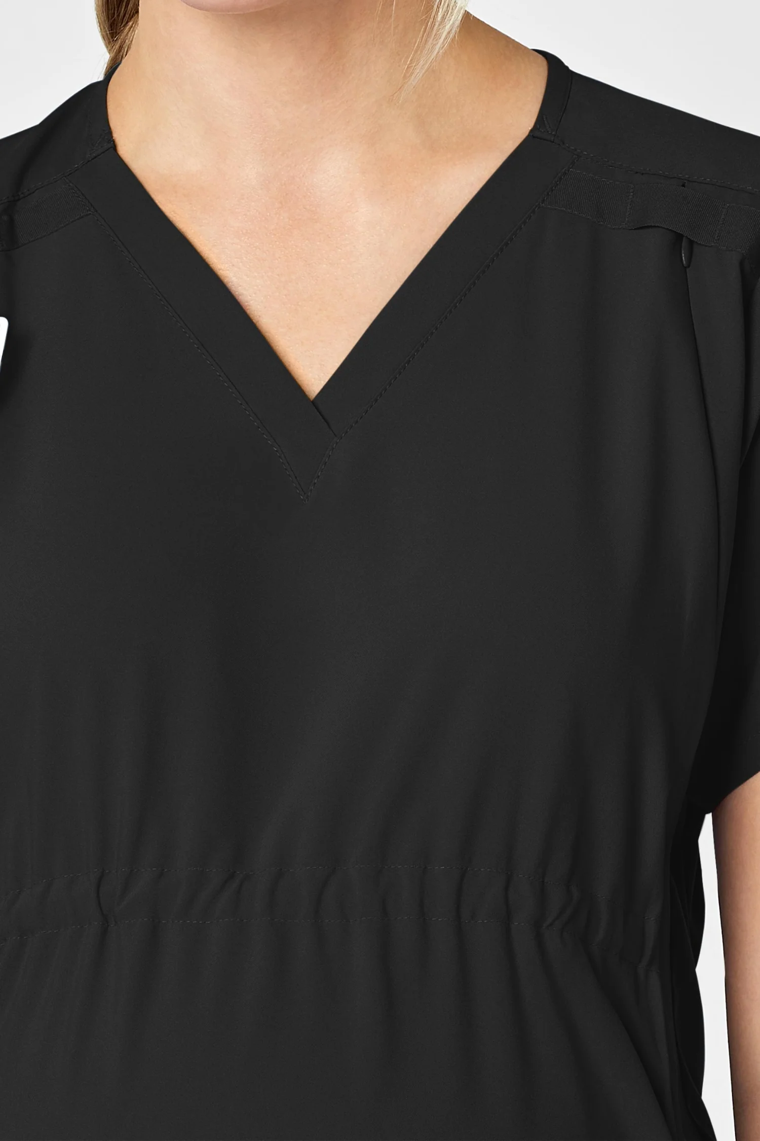- Un col en V avec une boucle d’épaule pour une touche élégante et professionnelle.
