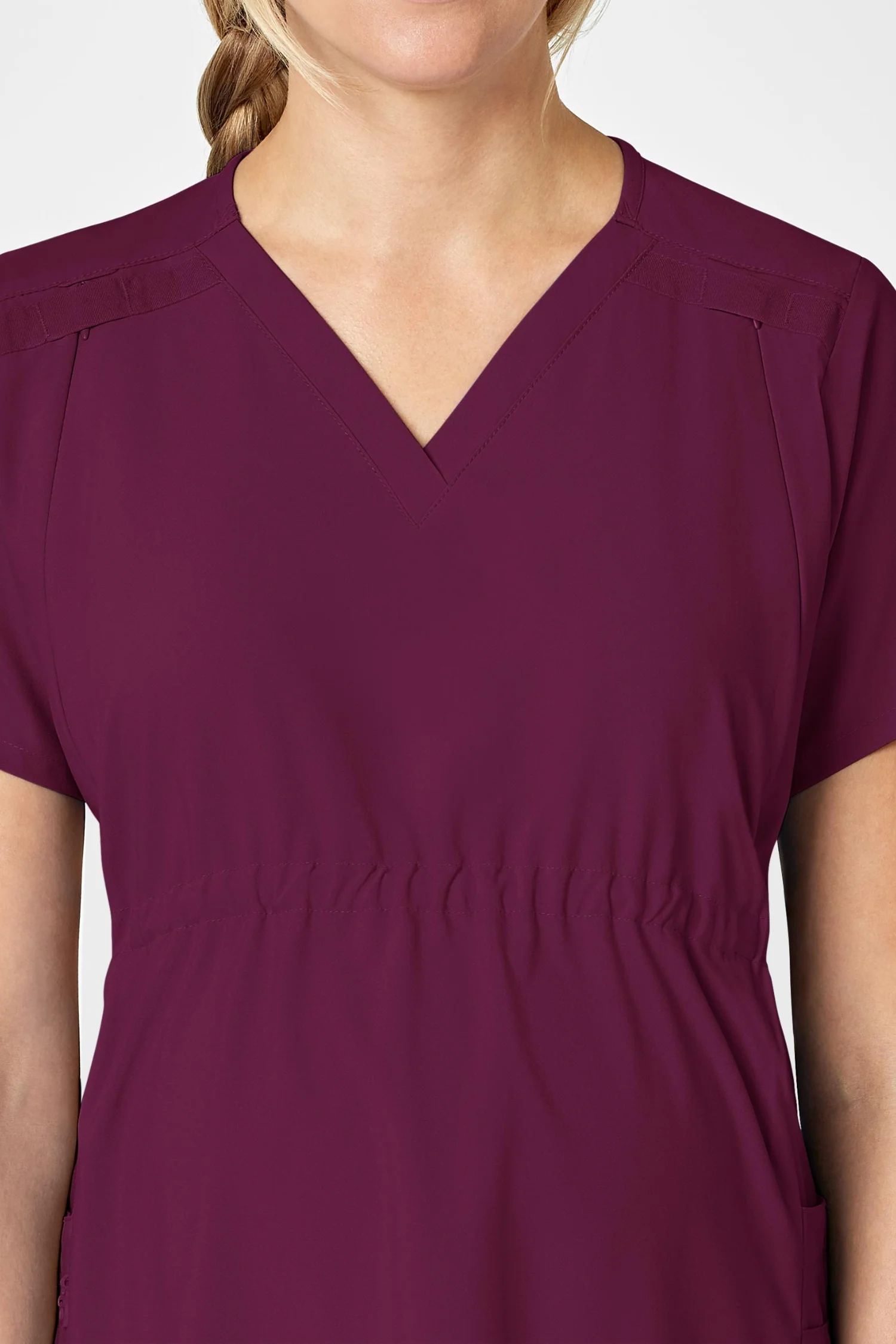 - Un col en V avec une boucle d’épaule pour une touche élégante et professionnelle.